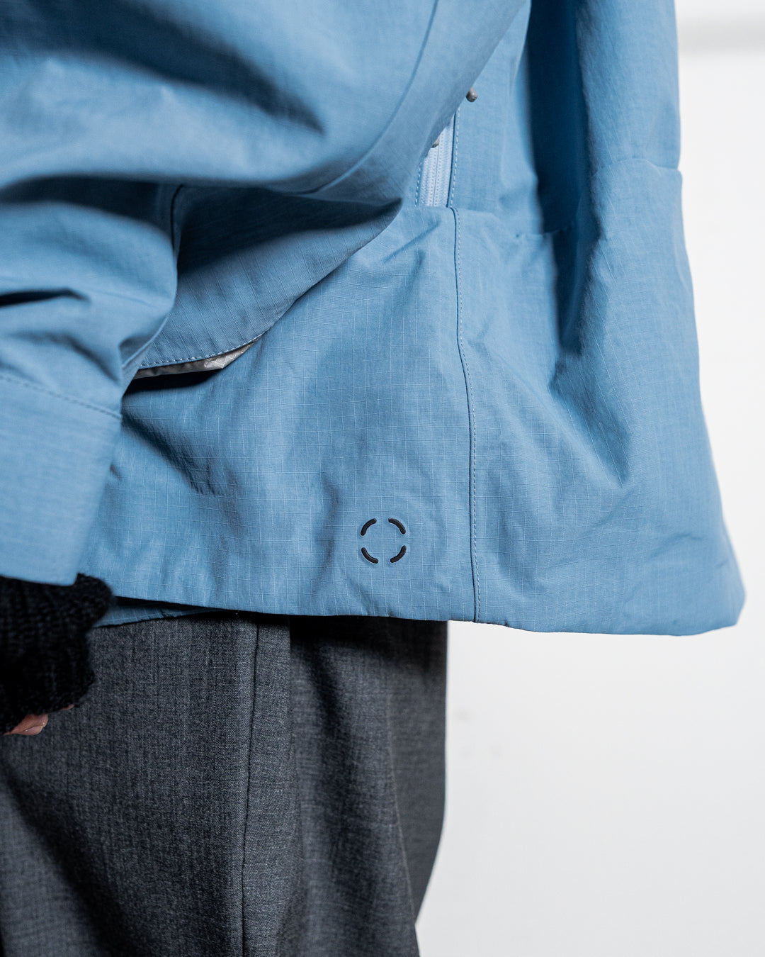 TACTICAL な雰囲気を出すため、左脇ポケットにナイロンベルトを配した。