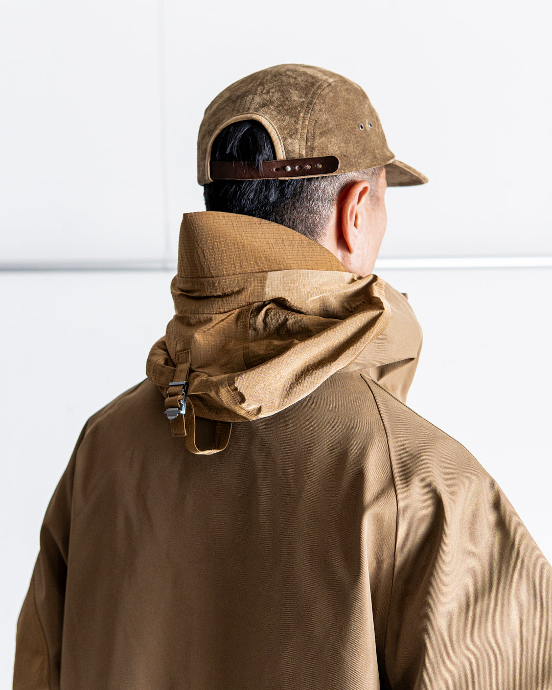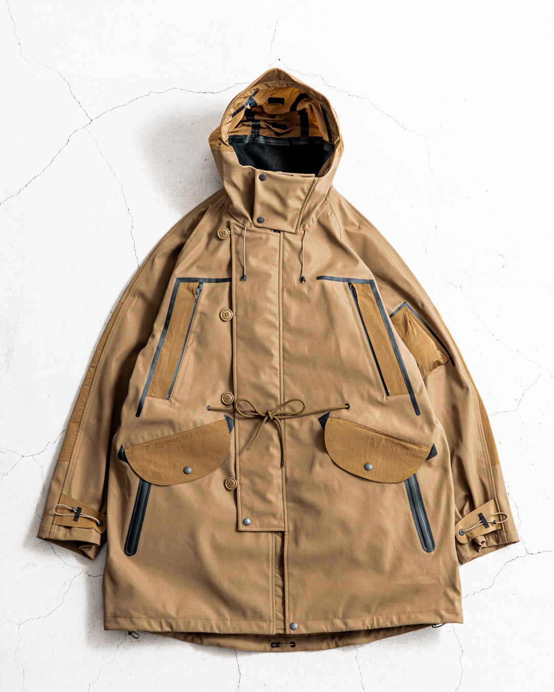 メイン生地には撥水加工のテックウールツイル生地にメンブレムを施した撥水、耐水、透湿性に優れたオリジナル生地を使用。ライナーは撥水性にも優れたコーデュラナイロンを使用し中綿部にはプリマロフトを採用。 N3Bをベーストしたデザインにフード上部、ポケットフラップ、スリーブタブ部などにリップナイロンを使用、背面には大きなゲームポケット。カフ部のスピンドル付きタブもオリジナルギミックで機能美を意識したnorbitらしいギミック満載の作品です。