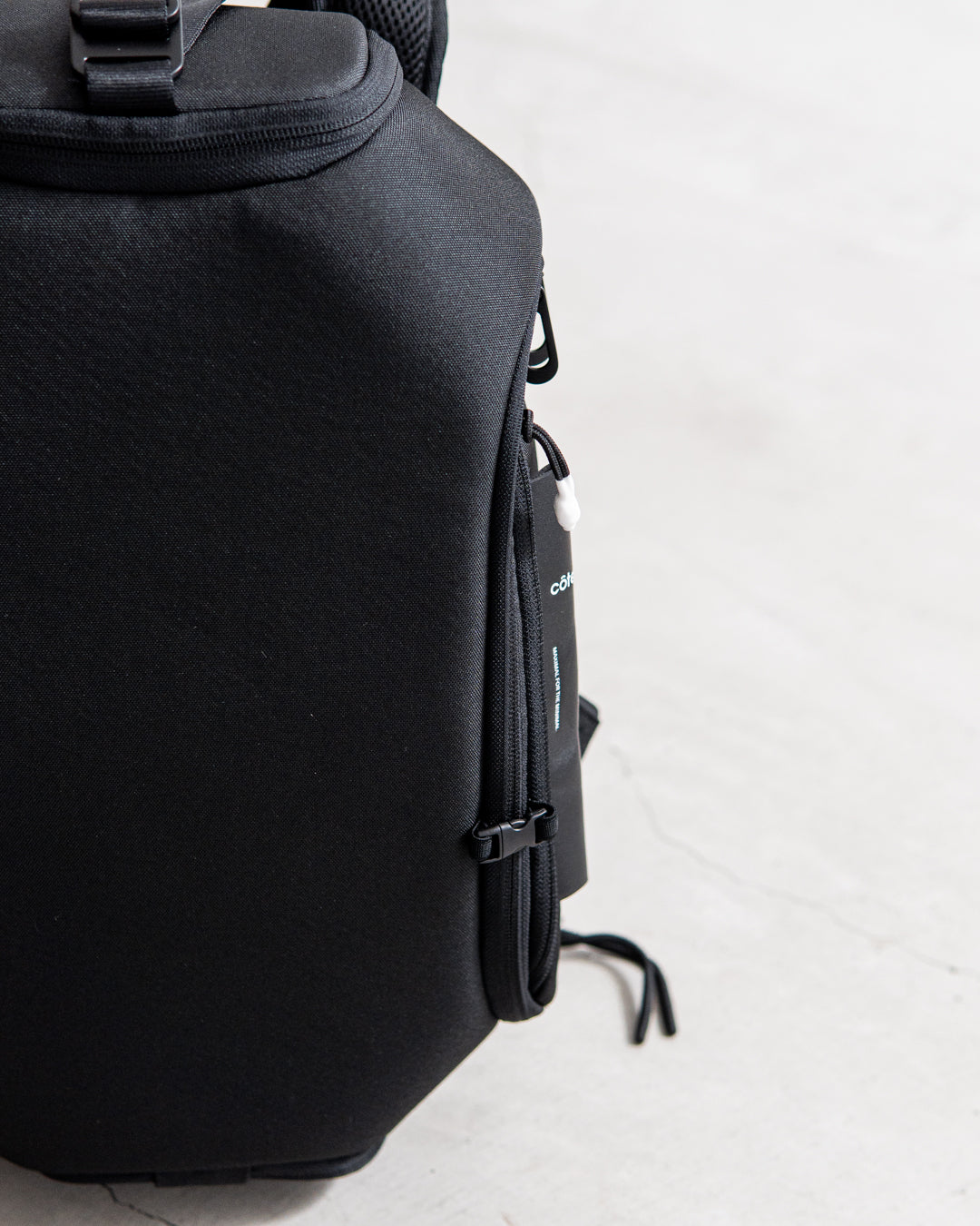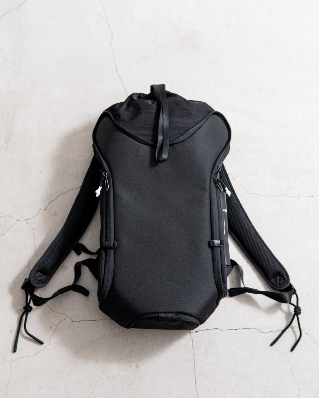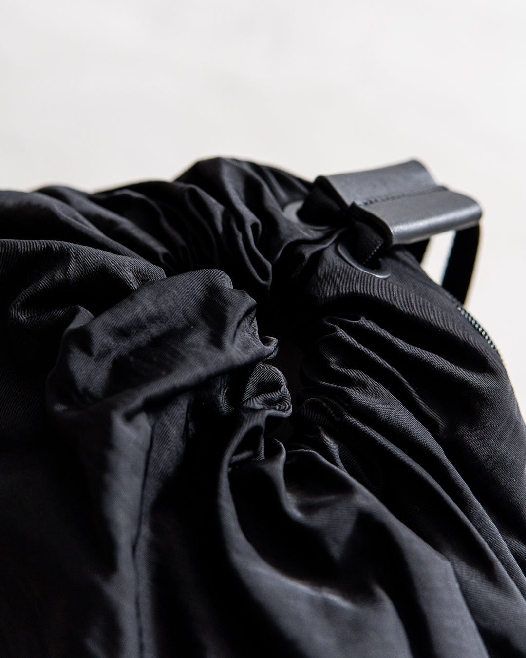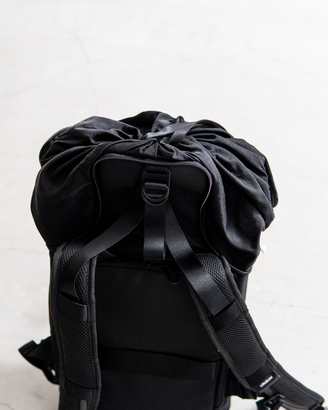 メインコンパートメントはバッグ上部の巾着となっており、ファスナーカバーで固定できます。