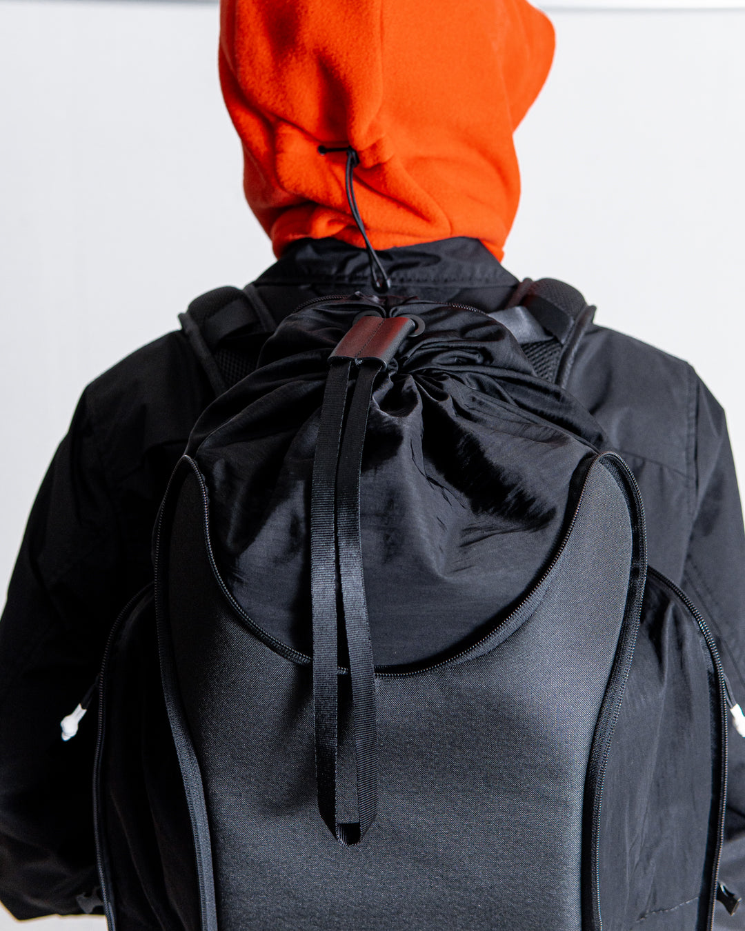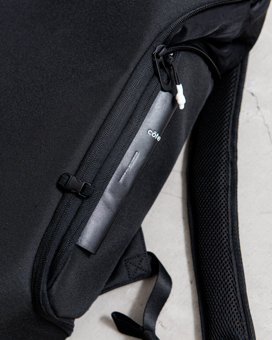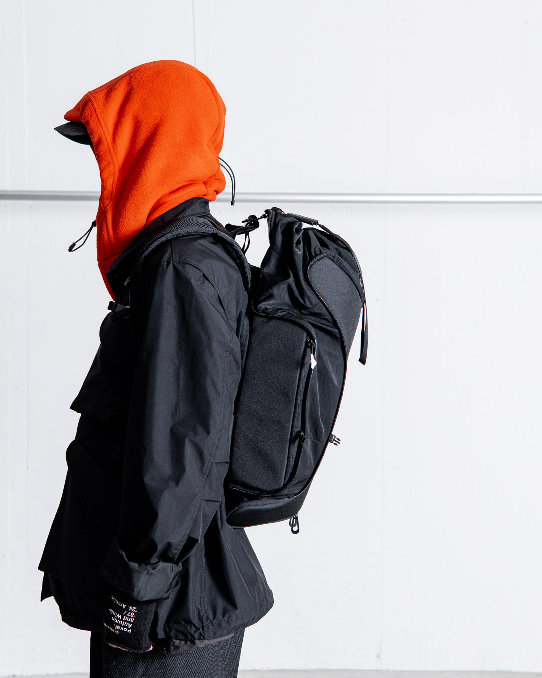 メインコンパートメントはバッグ上部の巾着となっており、ファスナーカバーで固定できます。
