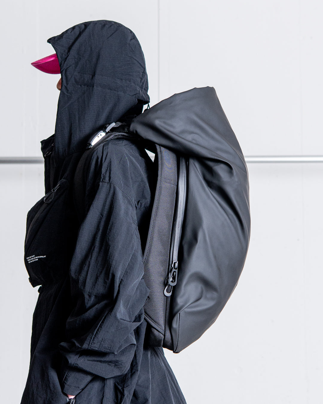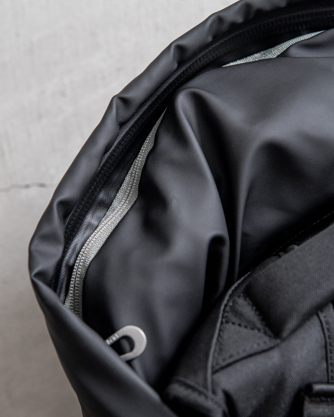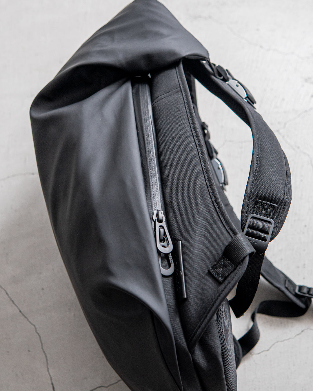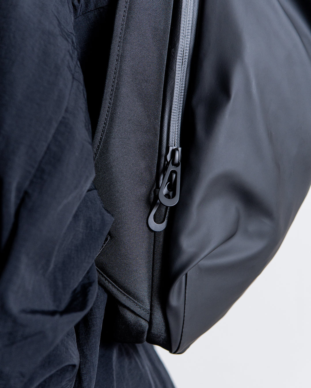 生地には防水コーティングを施したポリエステル素材「Obsidian」を使用し、収納の開閉部には止水ジッパーを採用しています。