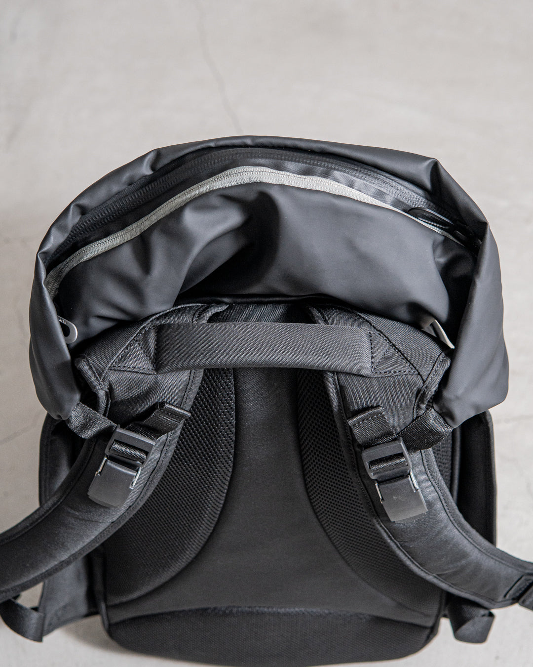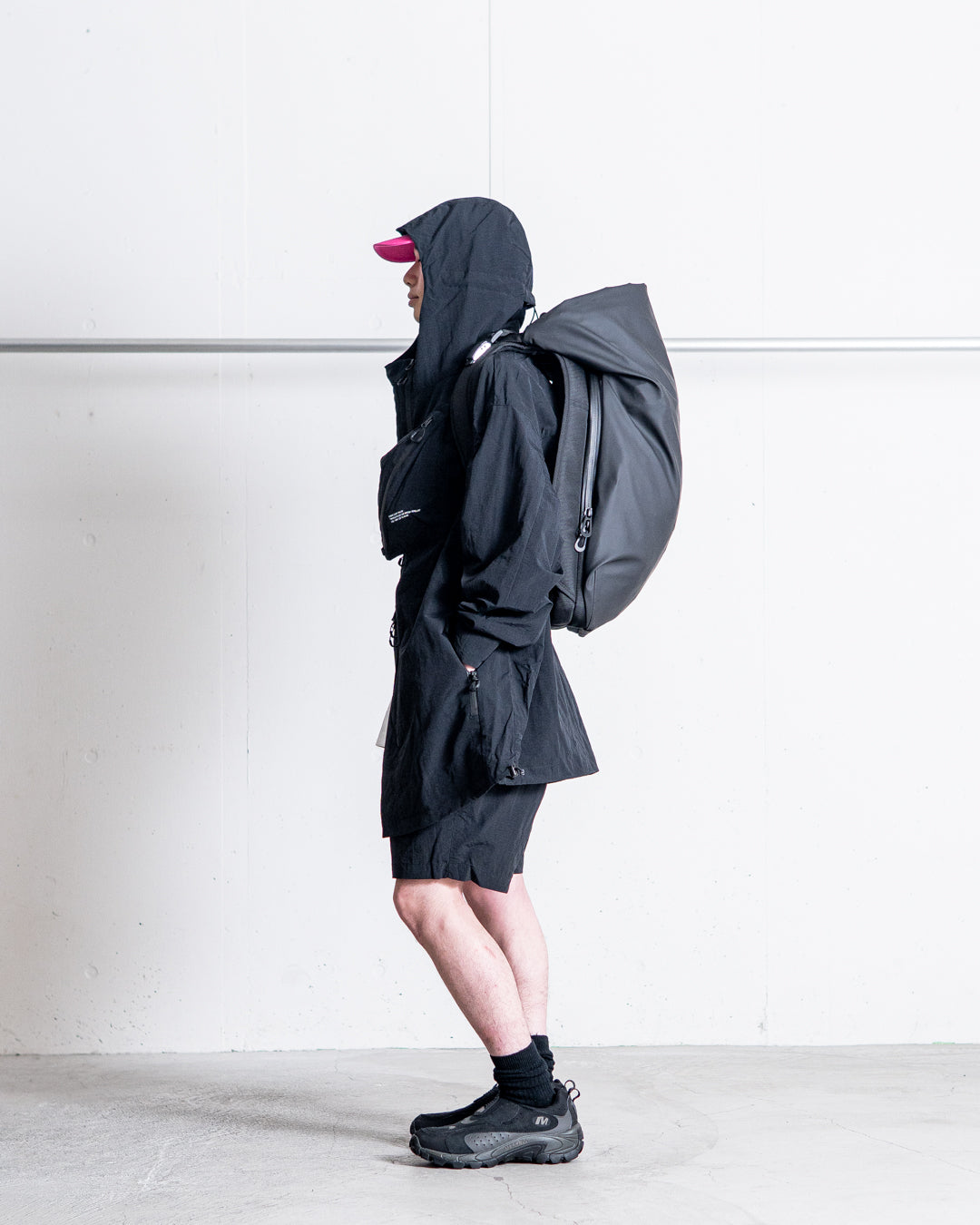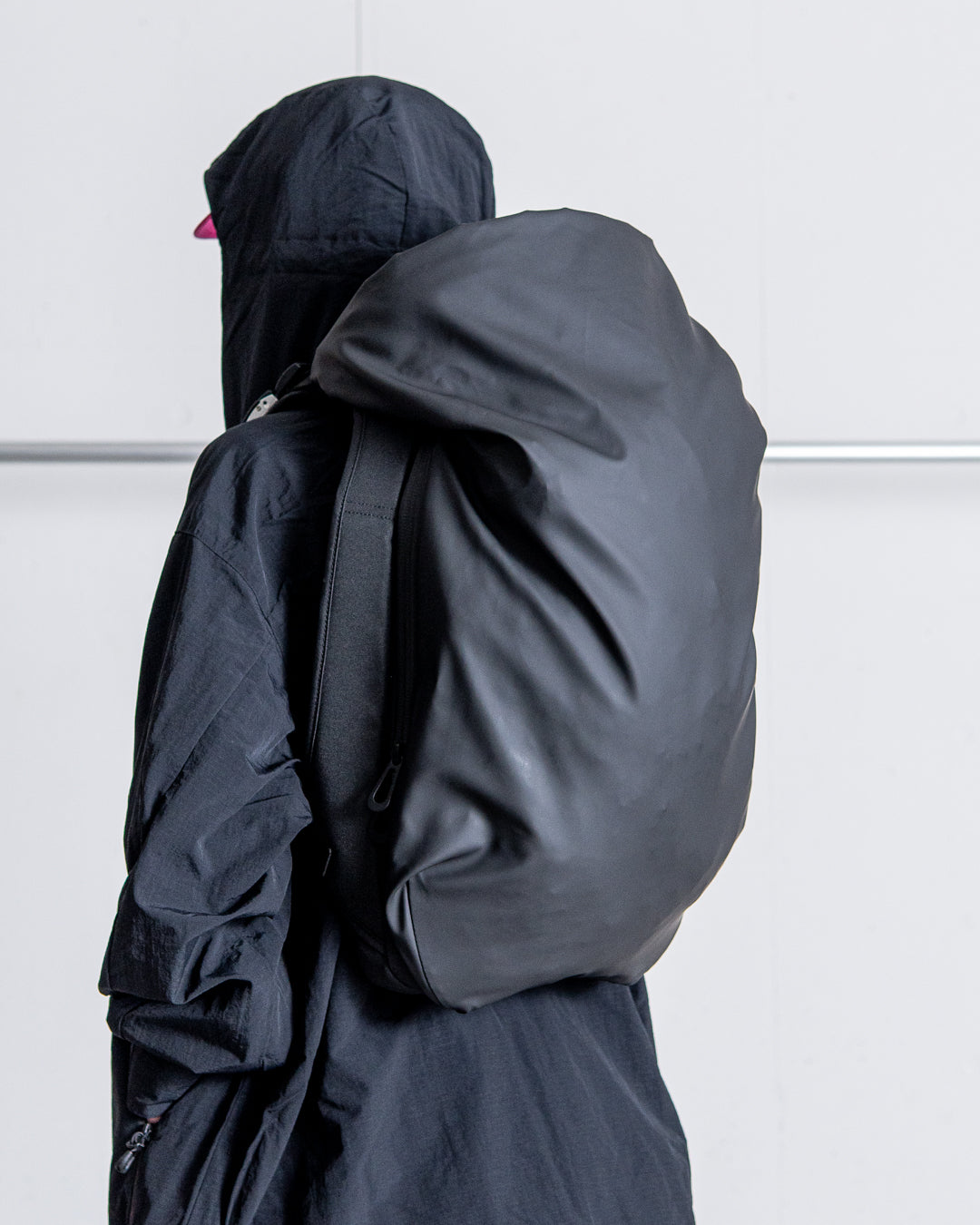 生地には防水コーティングを施したポリエステル素材「Obsidian」を使用し、収納の開閉部には止水ジッパーを採用しています。