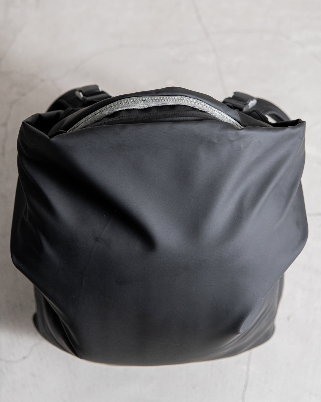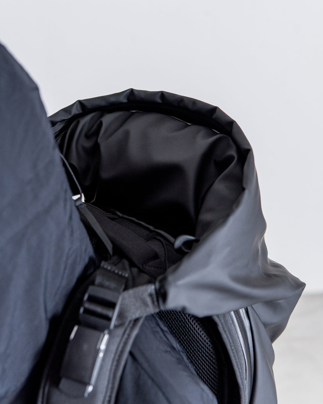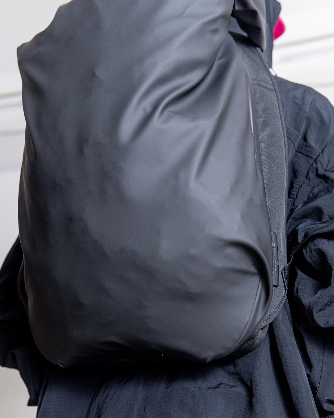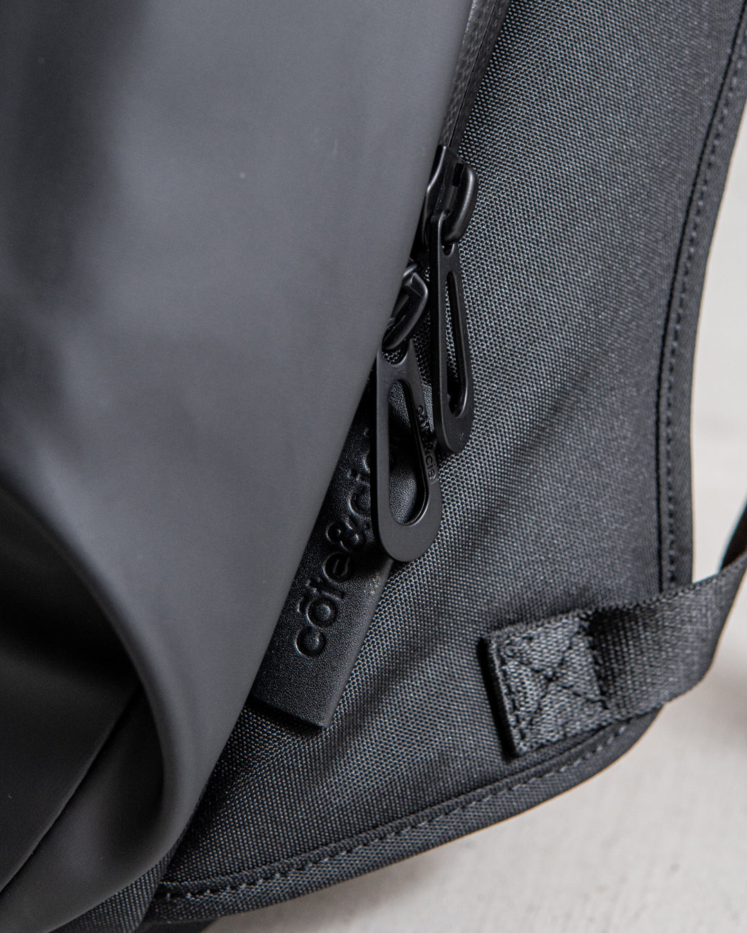 生地には防水コーティングを施したポリエステル素材「Obsidian」を使用し、収納の開閉部には止水ジッパーを採用しています。