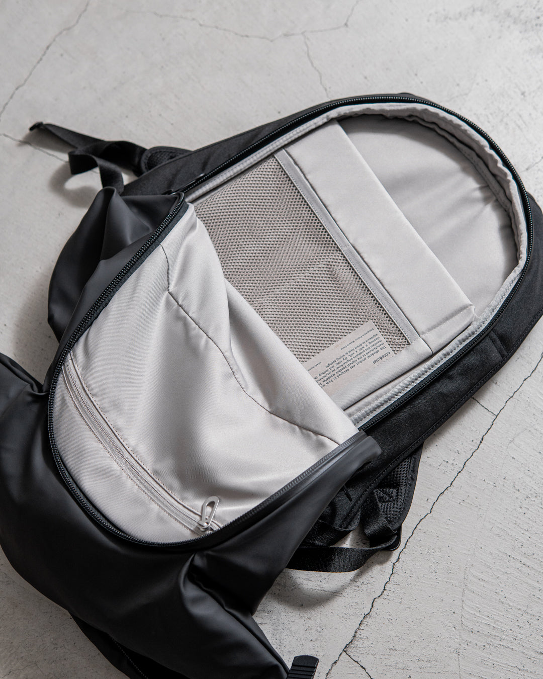 収納はメイン収納とラップトップ収納の2つに分けられ、トップのジッパーからアクセスするメイン収納は、袋状の大きな空間になっており一泊から二泊ほどの荷物も収納できる大容量。