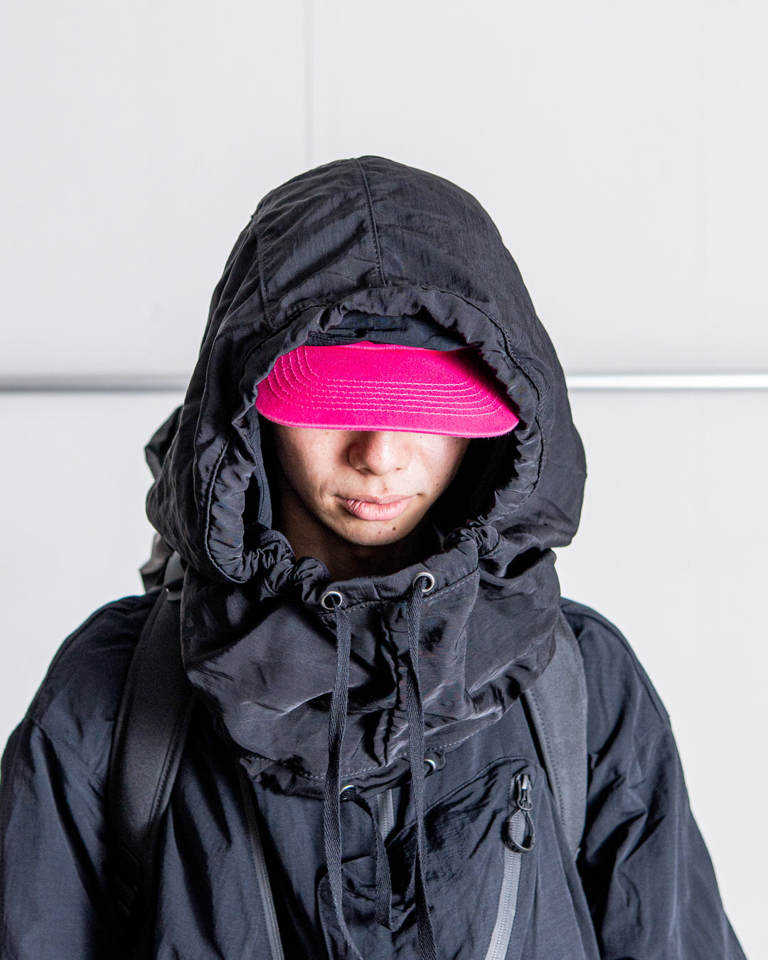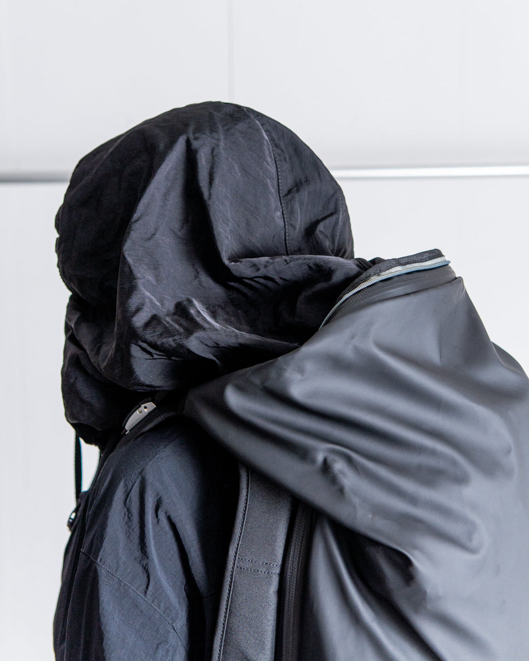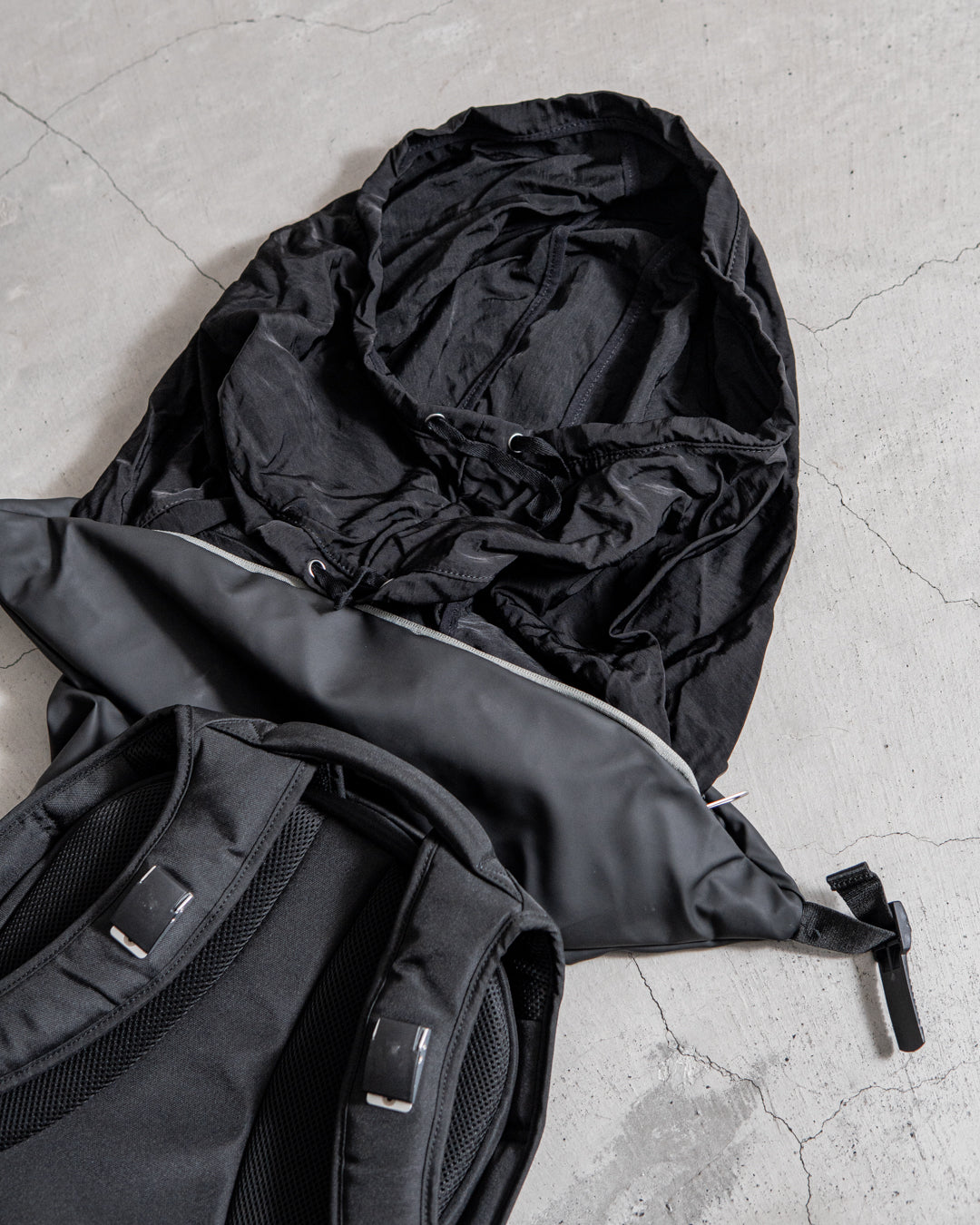 また、メイン収納のジッパーに並列して走るグレーのジッパーを開ければ、リップストップナイロンを使ったレインフードが。雨の多いフランス・パリの空気感を感じるギミックもパリのブランドならでは。