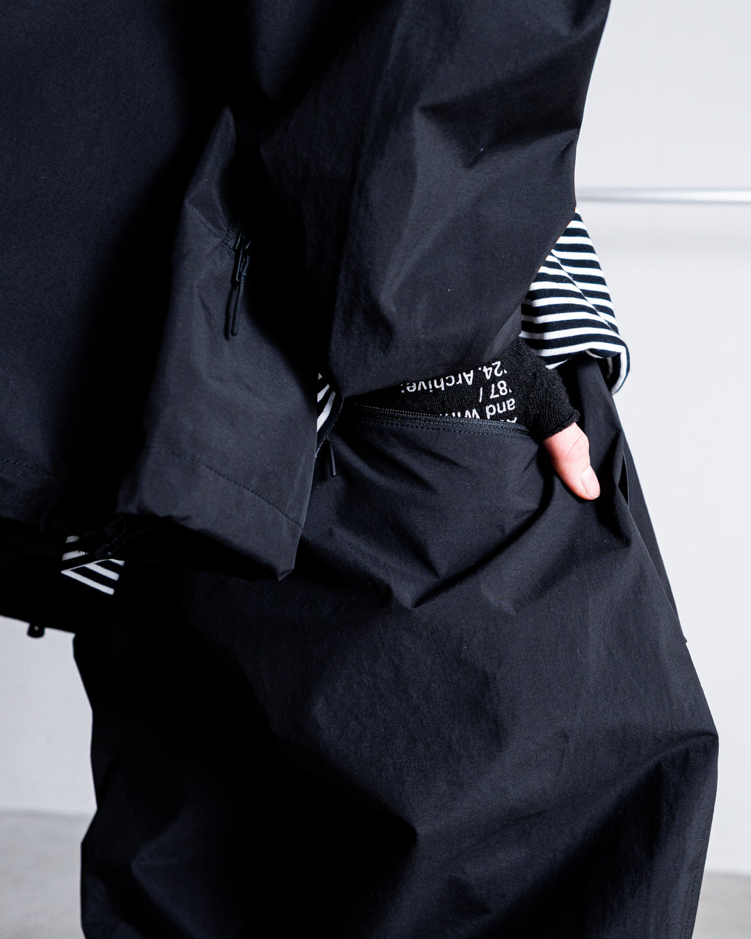 [MENS / セットアップ(Nylon Jacket)での着用 ]モデル 身長170cm 体重67kg / 着用サイズ L / 着用カラー Black