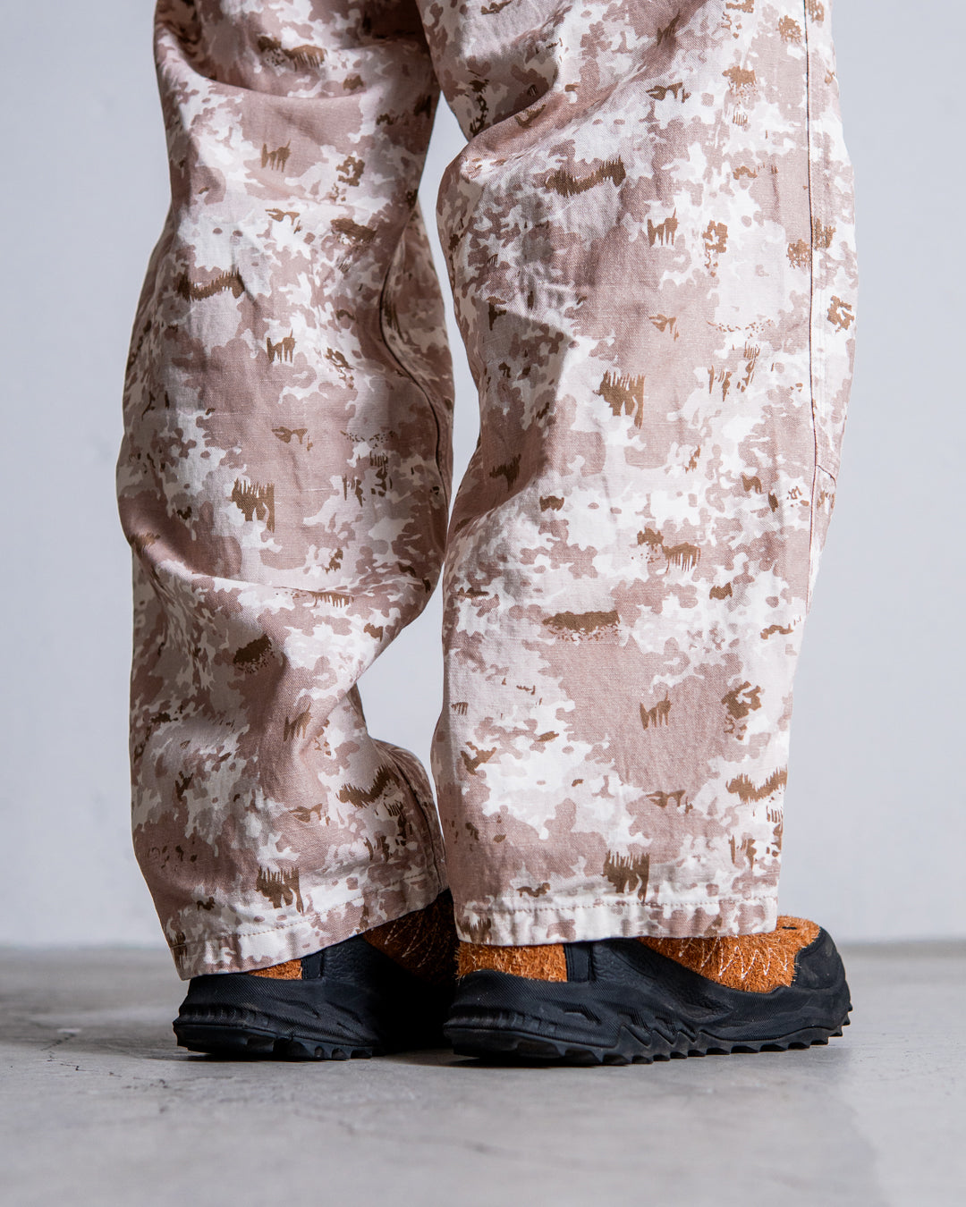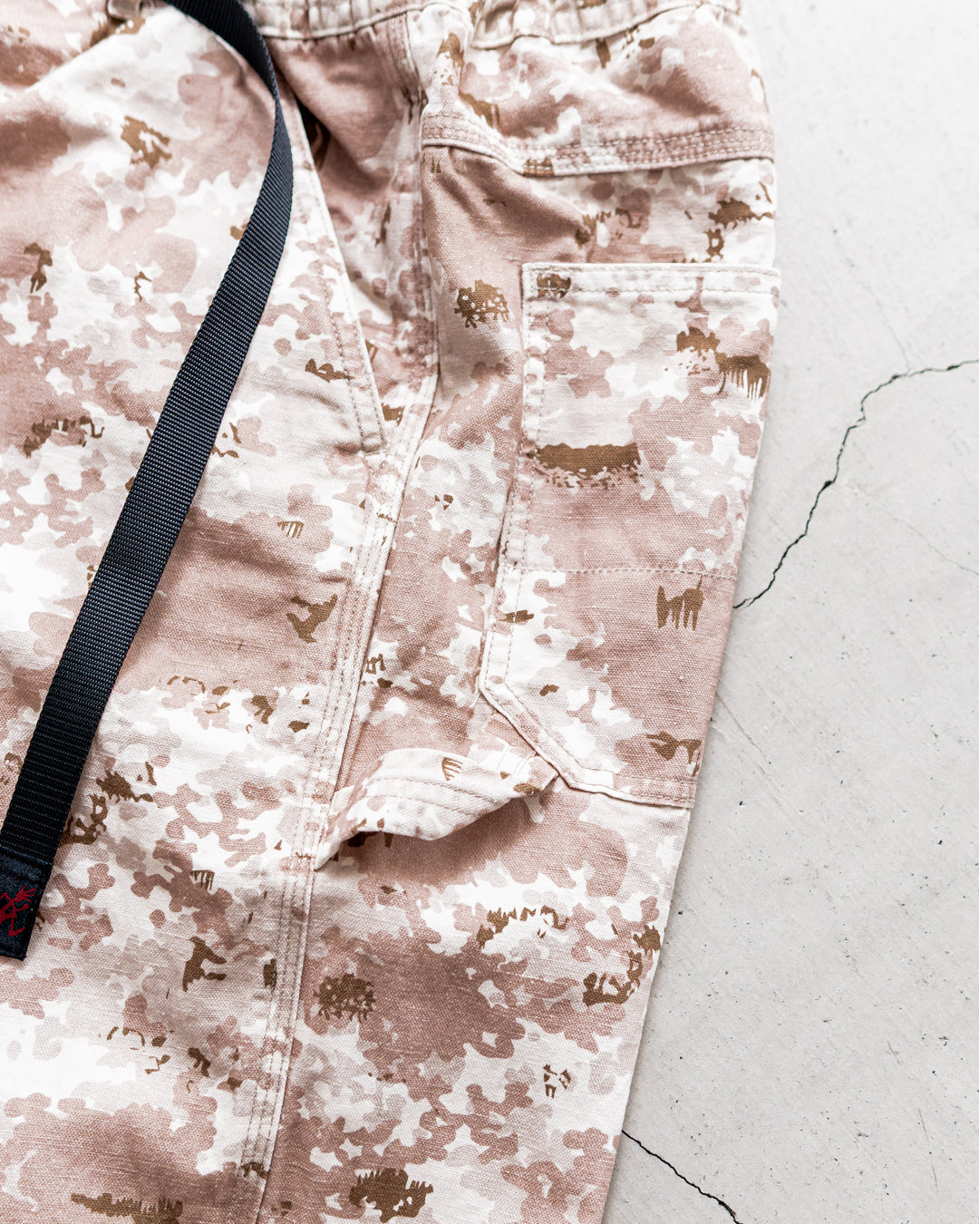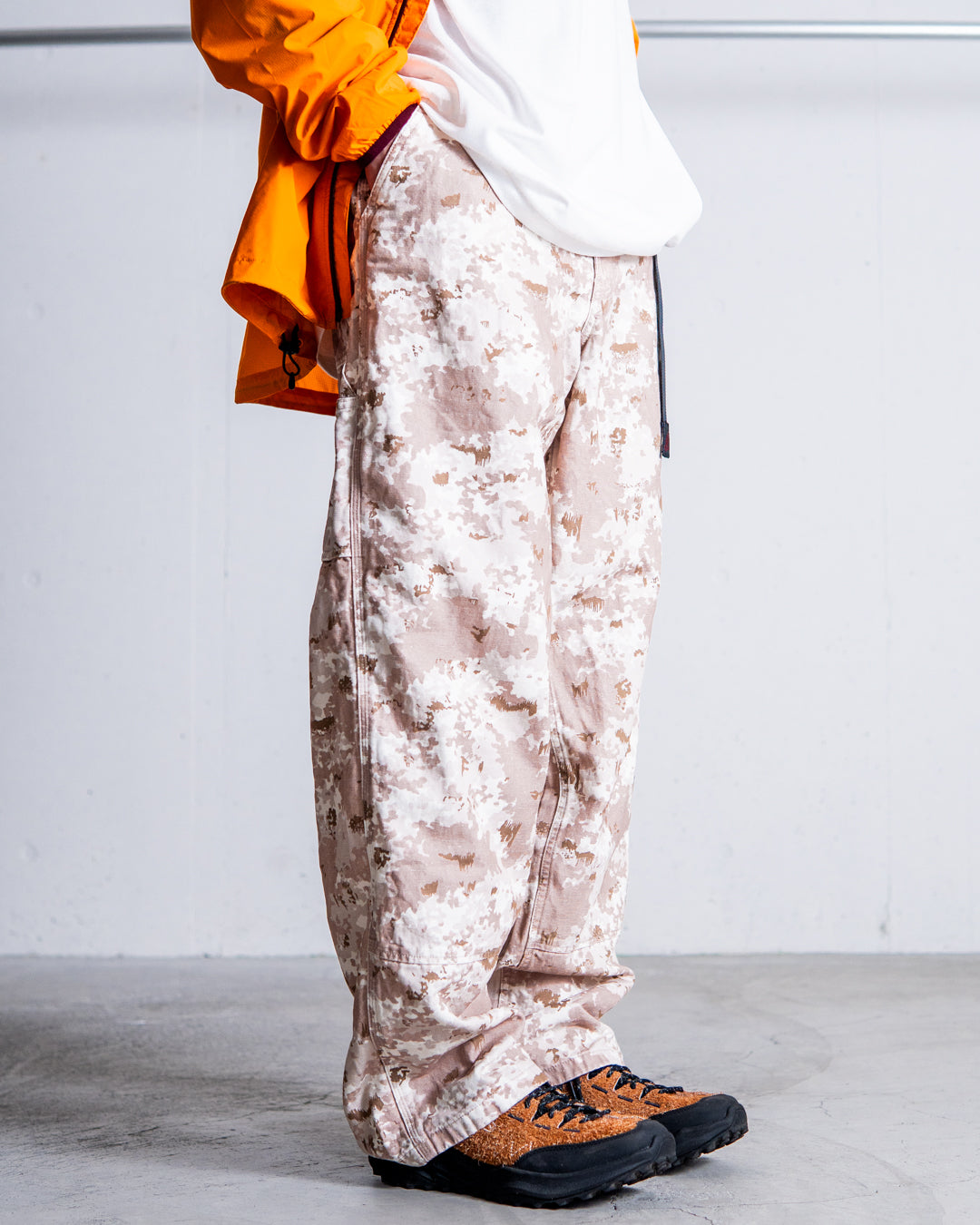 吸湿性と耐水性に優れたヘンプをブレンドした、ドライタッチな9オンスのキャンバス素材を採用したオリジナルCAMO柄での展開です。ハンマーポケットを含む7つのポケットやループといったワークディテールとの相性も良い、ゆとりあるシルエットです。