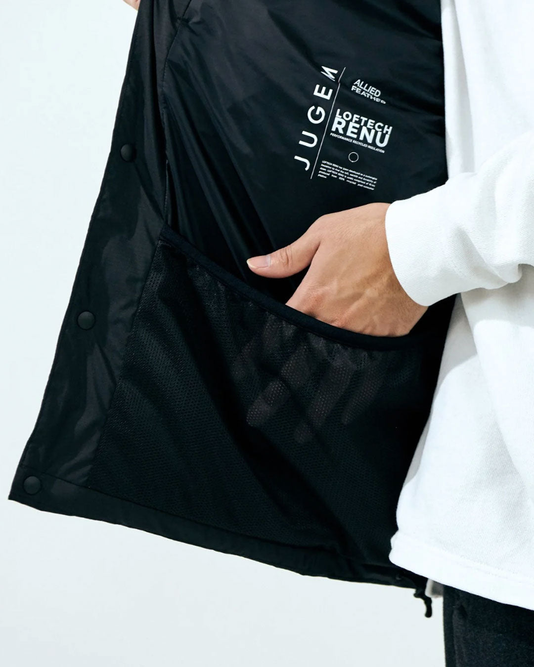 中綿には米国Allied Feather & Down社が開発した100%リサイクルの粒綿 LOFTECH RENU(TM)使用。一般的には600フィルパワーで良質とされているダウンですが700フィルパワー相当の保温力を誇る高品質のものを使用しております。