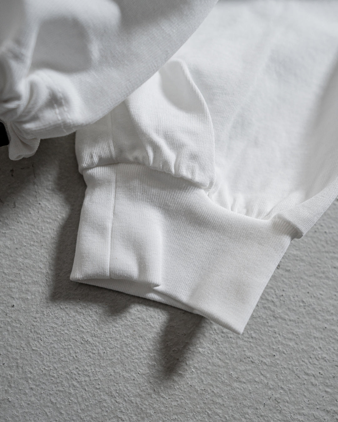 素材は同じく 30/2 コーマ糸で編み立てた、ほどよいウエイトの綿天竺Tシャツ。