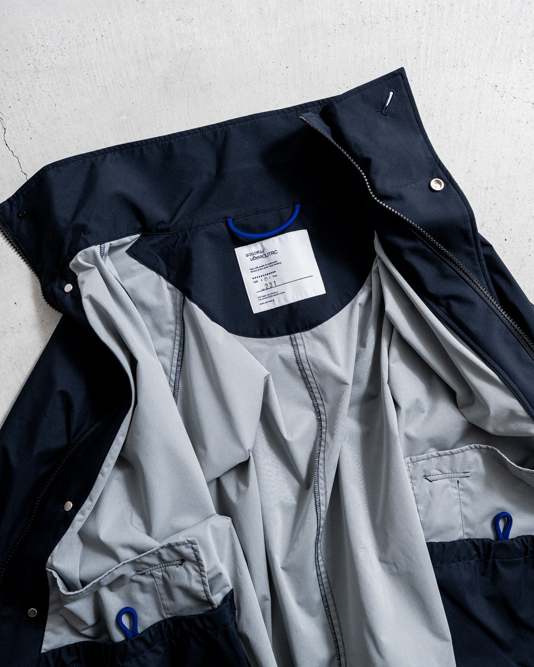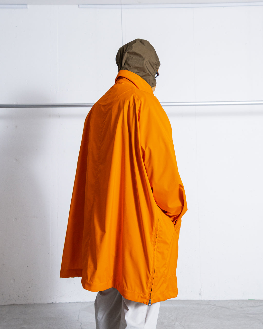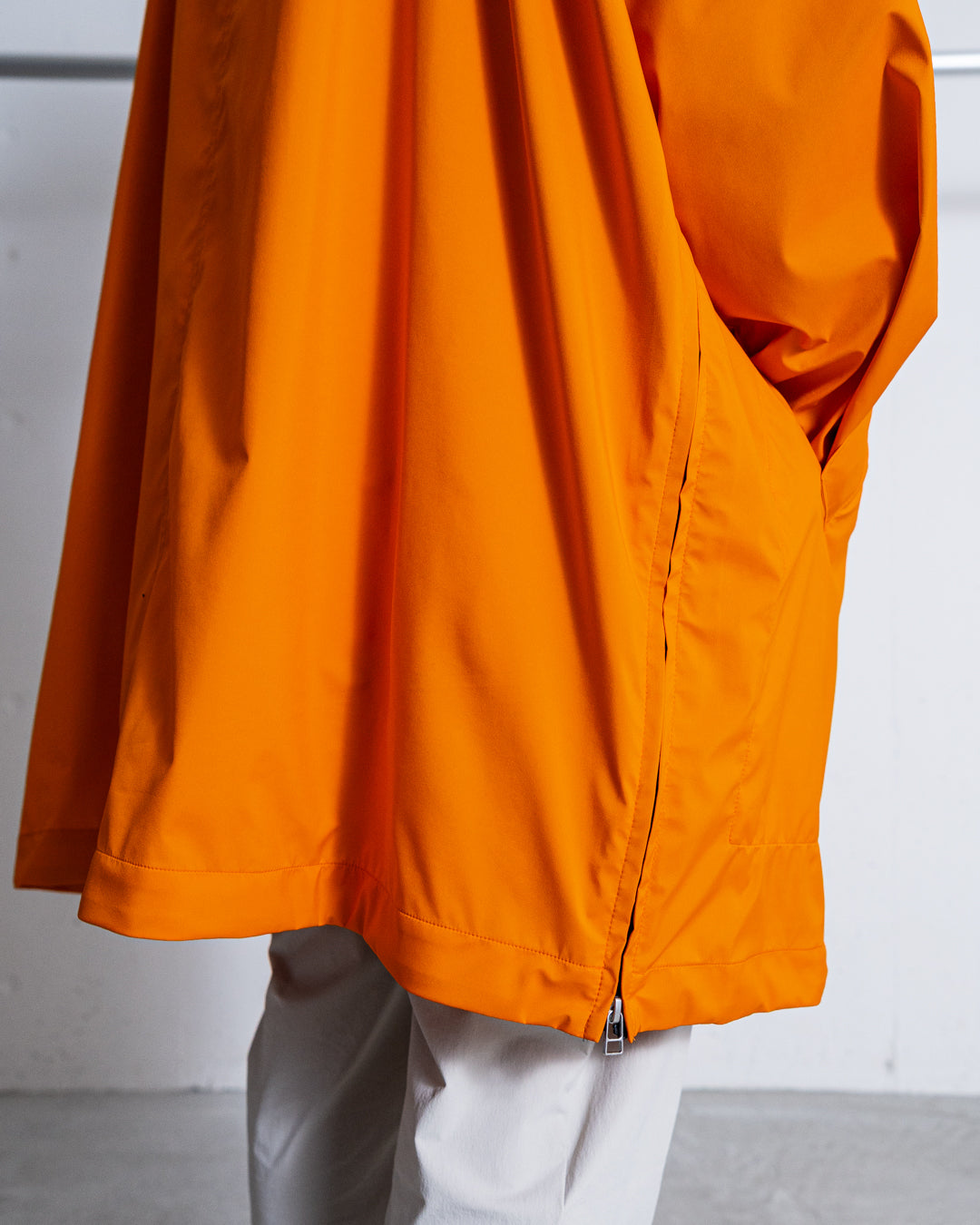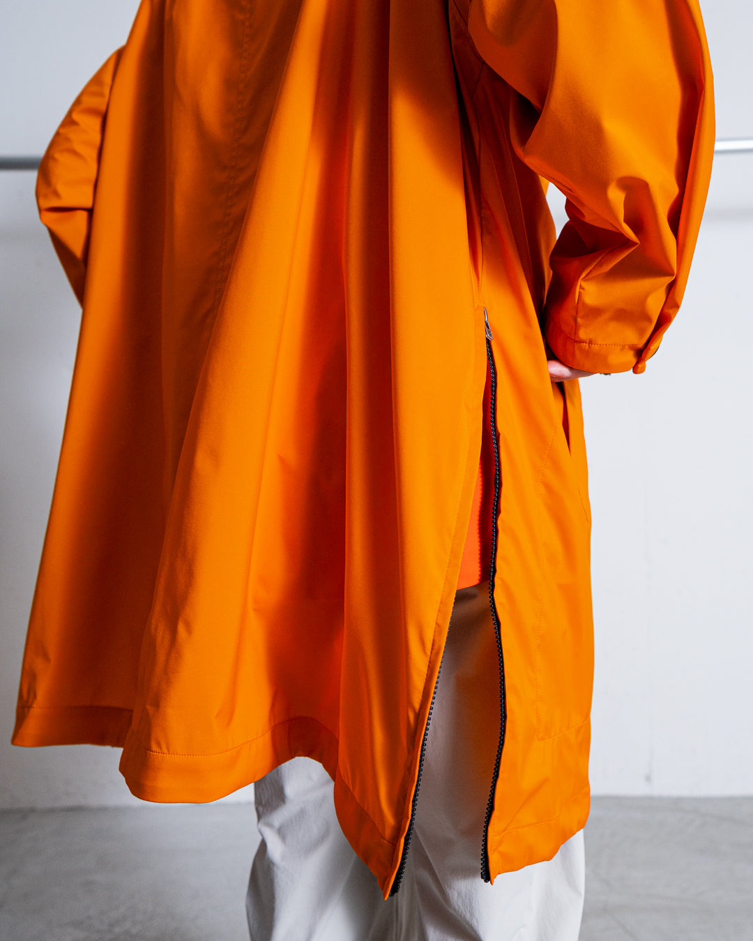 本格的なアウトドア仕様の3レイヤー素材を使用した ミドル丈のスタンドカラーコート。 表地にはリサイクルナイロンの マイクロリップ素材を採用。 薄手でしなやか、動きのある風合いが特徴です。 軽さに加え、素材本来のナチュラルストレッチに よりストレスフリーな着心地を実現しています。 2025AWにリリースしたスタンドカラーコートを ベースに、丈をミドル丈に修正。車や自転車での 移動時における実用性を高めるアップデートを 加えました。 透湿防水・撥水・防風といった機能性に加え、 前身頃の裾裏にはラップトップが収納できるほどの 大型ポケットを両サイドに配置。 バッグを持たずに外出できる仕様となっています。 袖口のカフスはボタンでシルエットの調整が可能。 さらに、両脇にはジップを備え、通気性や可動域の 調整にも対応しています。