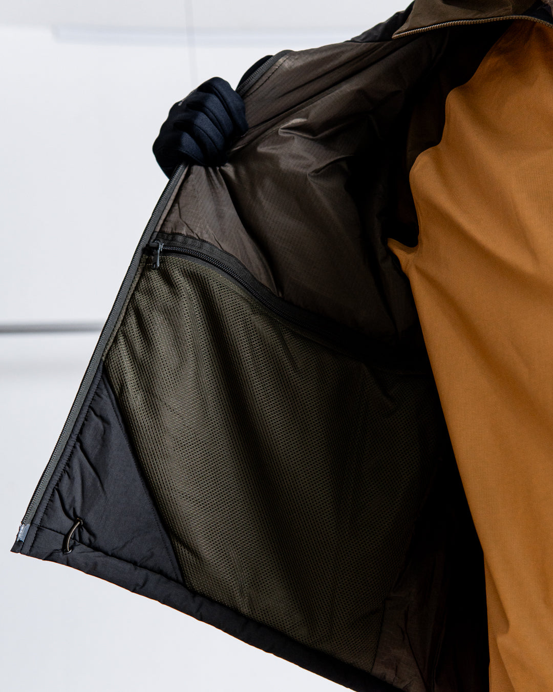 フードはファスナーでの脱着が可能で、内側のメッシュポケットもファスナー開閉になっている。