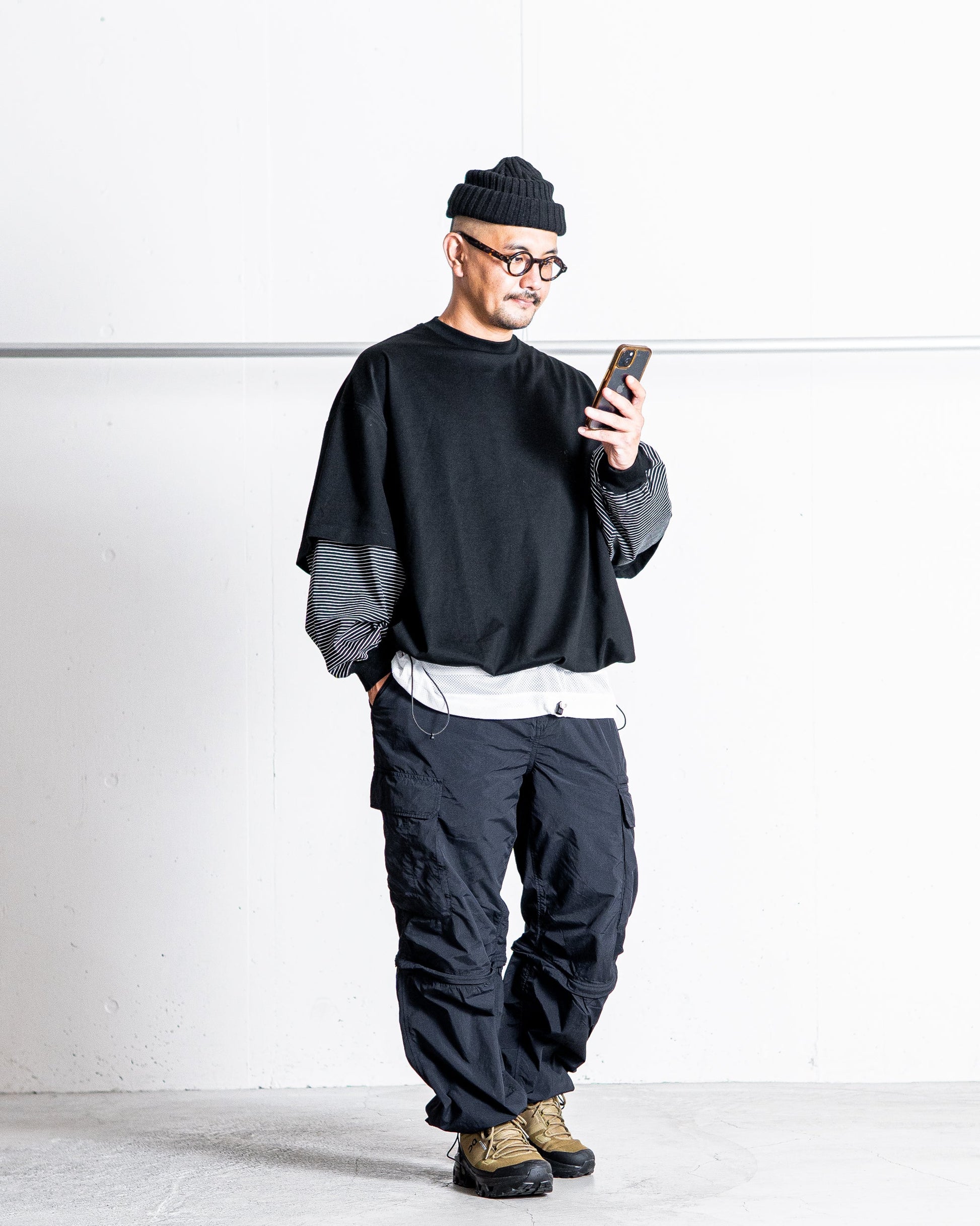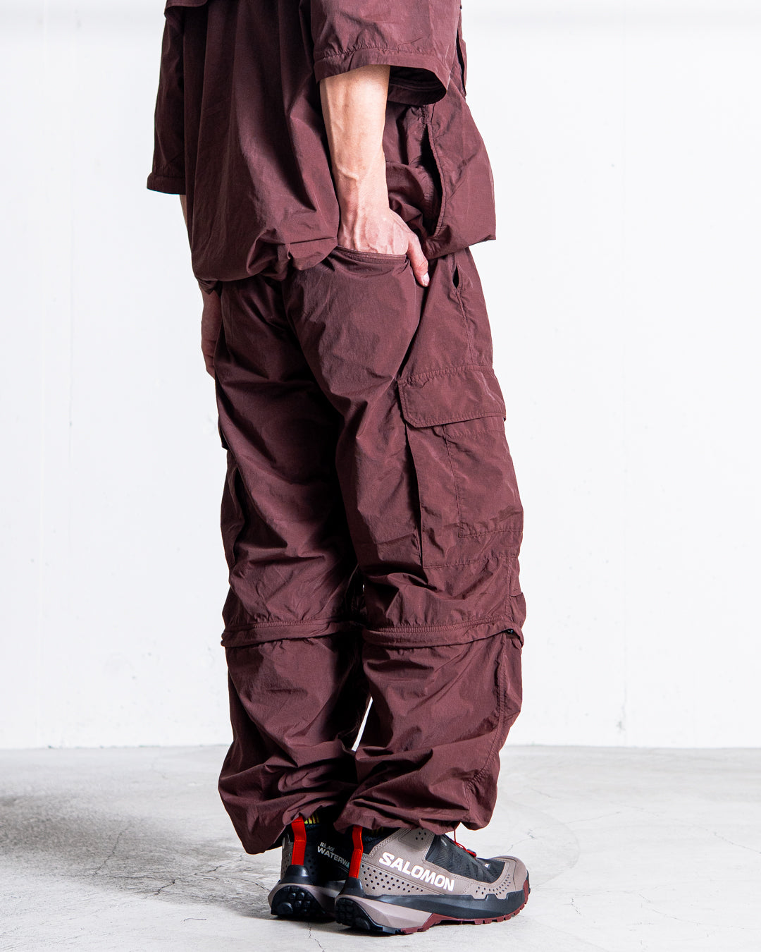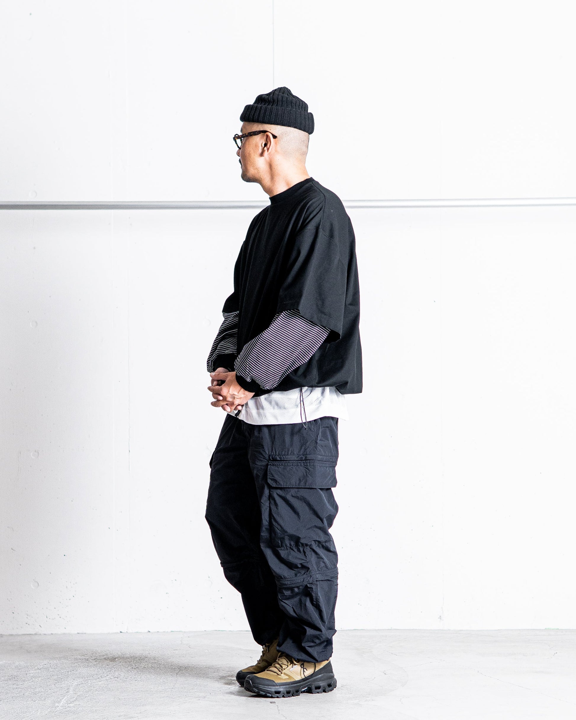 暑い時期はショート丈で取り入れ、カジュアルなサンダル合わせがおすすめです。ロングパンツでの着用時には、ボリュームのあるトレッキングシューズにもマッチします。