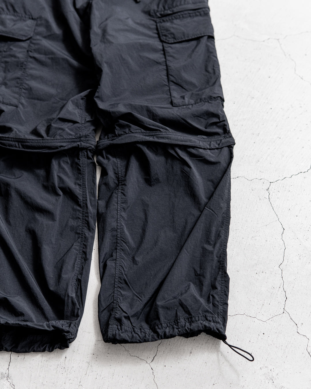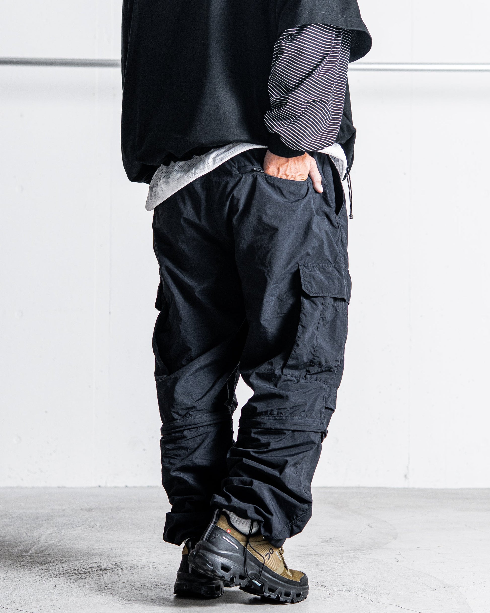 こちらは膝下部分をファスナーで取り外せる、2WAY仕様のコンバーチブルカーゴパンツ。ほどよくゆとりを持たせたストレートシルエットで、裾部分のアジャスターを利用してシルエットを変えられます。ウエストは締め付けのないゴムシャーリングとなり、スピンドルコードで調整可能。さらにベルトループ付きで、ベルトを使ったアレンジも楽しめます。脇のカーゴポケットやファスナー付きツールポケット、屈伸がしやすいよう施した膝のタックなど、使い勝手の良い豪華なディテールを搭載しました。