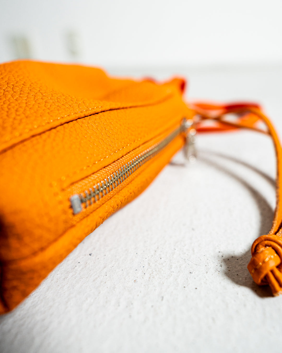サイドにはファスナーを配し、巾着を絞った状態でもスムーズに荷物へアクセスできます。