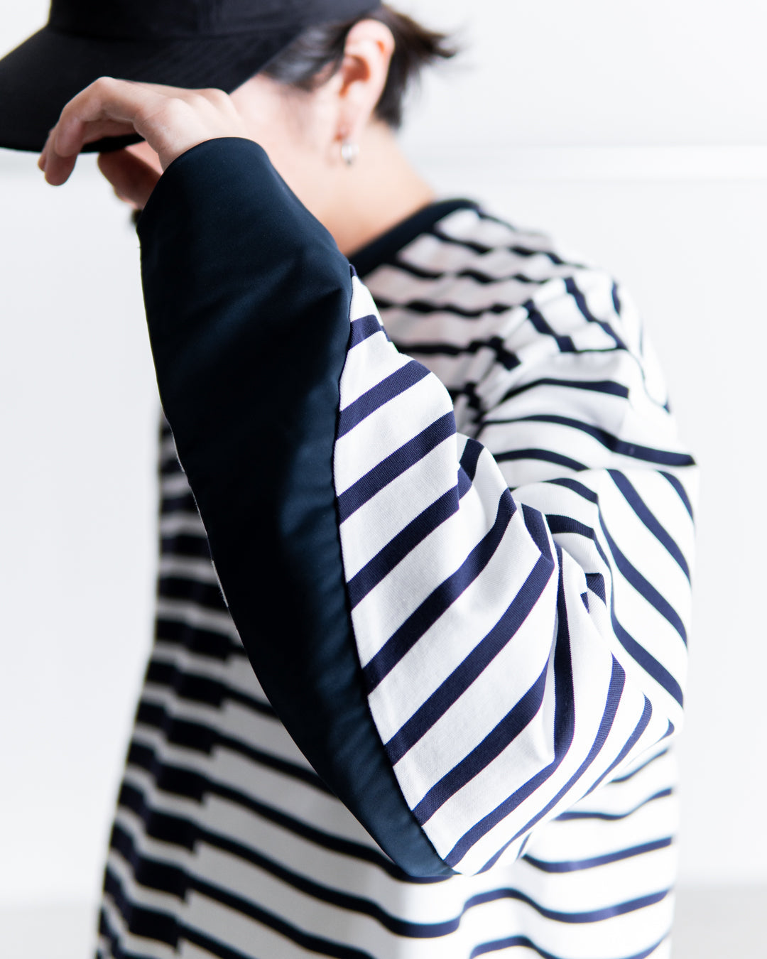 色違いのボーダーを中心で分けた丸胴タイプのTシャツ。